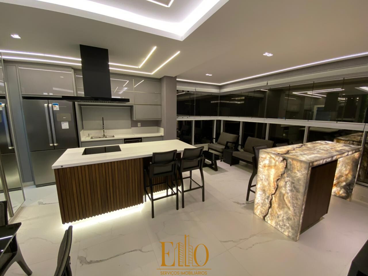 Cozinha e sacada com churrasqueira a carvão;